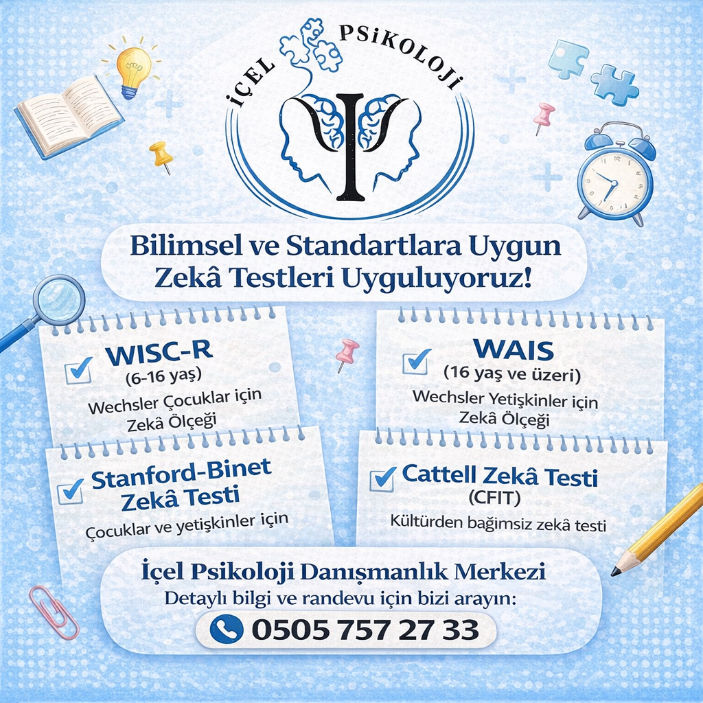 Mersin’de zeka testi yaptırmak isteyen aileler için İçel Psikoloji Danışmanlık Merkezi’nde uzman klinik psikolog tarafından uygulanan WAIS değerlendirmesi, çocuğunuzun güçlü ve desteklenmesi gereken alanlarını detaylı biçimde ortaya koyar.